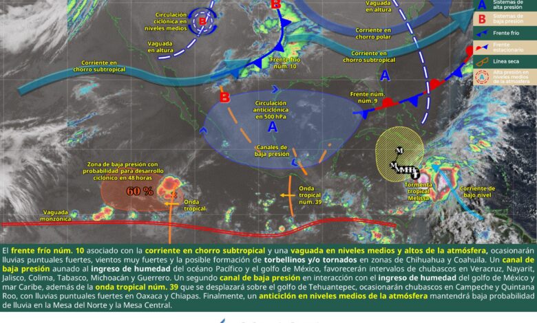 Hoy, el frente frío núm. 10 recorrerá el norte del país, asociado con la corriente en chorro subtropical y una vaguada en niveles medios y altos de la atmósfera, ocasionarán lluvias puntuales fuertes en Chihuahua (norte y noreste) y Coahuila (norte y noreste); rachas de viento de 65 a 80 km/h y posibles torbellinos y/o tornados en el norte de Chihuahua y noroeste de Coahuila. Un canal de baja presión sobre el interior del país, aunado al ingreso de humedad del océano Pacífico y el golfo de México favorecerán intervalos de chubascos en Veracruz (regiones Las Montañas y Olmeca), Nayarit (norte, centro y sur), Jalisco (oeste y sur), Colima, Tabasco (oeste y centro), Michoacán (centro, sur y costa) y Guerrero (norte, costa y sureste). Viento de componente sur (surada) de 20 a 35 km/h con rachas de 50 a 70 km/h en Coahuila (este), Nuevo León y Tamaulipas. Un segundo canal de baja presión sobre el sureste de México y la península de Yucatán en interacción con el ingreso de humedad del golfo de México y mar Caribe, además de la onda tropical núm. 39 que se desplazará sobre el golfo de Tehuantepec, ocasionarán chubascos en Campeche (oeste) y Quintana Roo (sur), con lluvias puntuales fuertes en Oaxaca (este, suroeste y costa) y Chiapas (centro y sur). Finalmente, un anticiclón en niveles medios de la atmósfera mantendrá baja probabilidad de lluvia en la Mesa del Norte y la Mesa Central.