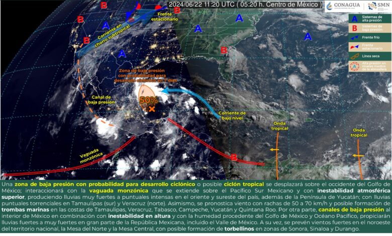 Durante este día, una zona de baja presión con probabilidad para desarrollo ciclónico o posible ciclón tropical se desplazará sobre el occidente del Golfo de México; interaccionará con la vaguada monzónica que se extiende sobre el Pacífico Sur Mexicano y con inestabilidad atmosférica superior, produciendo lluvias muy fuertes a puntuales intensas en el oriente y sureste del país, además de la Península de Yucatán; con lluvias puntuales torrenciales en Tamaulipas (sur) y Veracruz (norte). Asimismo, se pronostica viento con rachas de 50 a 70 km/h y posible formación de trombas marinas en las costas de Tamaulipas, Veracruz, Tabasco, Campeche, Yucatán y Quintana Roo. Por otra parte, canales de baja presión al interior de México en combinación con inestabilidad en altura y con la humedad procedente del Golfo de México y Océano Pacífico, propiciarán lluvias fuertes a muy fuertes en gran parte de la República Mexicana, incluido el Valle de México. A su vez, se prevén vientos fuertes en el noroeste del territorio nacional, la Mesa del Norte y la Mesa Central, con posible formación de torbellinos en zonas de Sonora, Sinaloa y Durango.