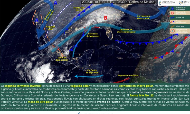 Este día, la segunda tormenta invernal se ha debilitado a una vaguada polar extendida sobre el noroeste y norte del territorio nacional y en interacción con la corriente en chorro polar, mantendrá el ambiente frío a gélido, y lluvias e intervalos de chubascos en dichas regiones, así como vientos muy fuertes con rachas de hasta 90 km/h sobre entidades de la Mesa del Norte y la Mesa Central; asimismo, prevalecerán las condiciones para la caída de nieve o aguanieve en las sierras de Durango, Chihuahua y Coahuila, además de lluvia engelante en Zacatecas y Nuevo León (norte). Por otra parte, el frente frío No. 22 se desplazará rápidamente sobre el noreste y oriente del país, ocasionando lluvias con chubascos en dichas regiones, con lluvias puntuales fuertes en Nuevo León, San Luis Potosí y Veracruz. La masa de aire polar que impulsará al frente generará evento de “Norte” fuerte a muy fuerte con rachas de viento de hasta 90 km/h en Tamaulipas y Veracruz, además de mantener el ambiente frío durante la mañana y noche sobre entidades del noreste, oriente y centro de la República Mexicana. Finalmente, el ingreso de humedad del océano Pacífico, originará lluvias e intervalos de chubascos en zonas del occidente, centro, sur y sureste de México, pronosticándose lluvias puntuales fuertes en Guerrero.