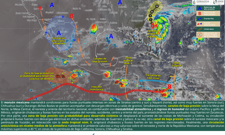 Este día, el monzón mexicano mantendrá condiciones para lluvias puntuales intensas en zonas de Sinaloa (centro y sur) y Nayarit (norte), así como muy fuertes en Sonora (sur), Chihuahua (sur) y Durango; dichas lluvias se podrían acompañar con descargas eléctricas y caída de granizo. Simultáneamente, canales de baja presión sobre la Mesa del Norte, la Mesa Central, el noreste y oriente del territorio nacional, en combinación con inestabilidad atmosférica y el ingreso de humedad del océano Pacífico y golfo de México, originarán chubascos y lluvias fuertes en los estados del noreste, occidente, centro y oriente del país; pronosticándose lluvias puntuales muy fuertes en Zacatecas. Por otra parte, una zona de baja presión con probabilidad para desarrollo ciclónico se desplazará al suroeste de las costas de Michoacán y Colima, su circulación propiciará lluvias fuertes con descargas eléctricas en dichas entidades, además de Guerrero y Jalisco. A su vez, otro canal de baja presión sobre el sureste mexicano y la península de Yucatán, en interacción con la onda tropical núm. 9, originará chubascos y lluvias fuertes en las regiones mencionadas. Finalmente, una circulación anticiclónica en niveles medios de la atmósfera mantendrá el ambiente caluroso a muy caluroso sobre el noroeste y norte de la República Mexicana; con temperaturas máximas superiores a 40 °C en zonas de la península de Baja California, Sonora, Chihuahua y Sinaloa.