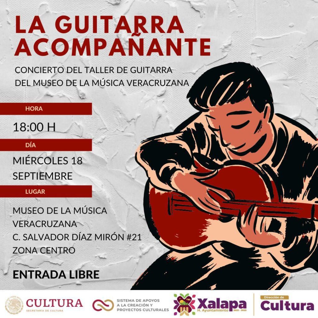 El miércoles 18 de septiembre a las 18:00 horas, en el Museo de la Música Veracruzana, se efectuará el concierto del taller “La guitarra acompañante”; en paralelo, el Dúo Clásico de la Dirección de Actividades Artísticas de la Secretaría de Educación de Veracruz (SEV) ofrecerá un recital en este mismo recinto.