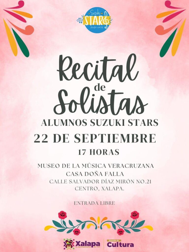 El sábado 21 y domingo 22 en el parque Benito Juárez se realizará el Festival artesanal “México lindo & Querido”. El 21, a las 19:30 horas, en el auditorio de la IMAC, Fredy Vivanco presentará la obra “Las crónicas de Consuelo”; y el 22 a las 17:00 horas en el Museo de la Música Veracruzana, los alumnos de Suzuki Star ofrecerán un recital de solistas.
