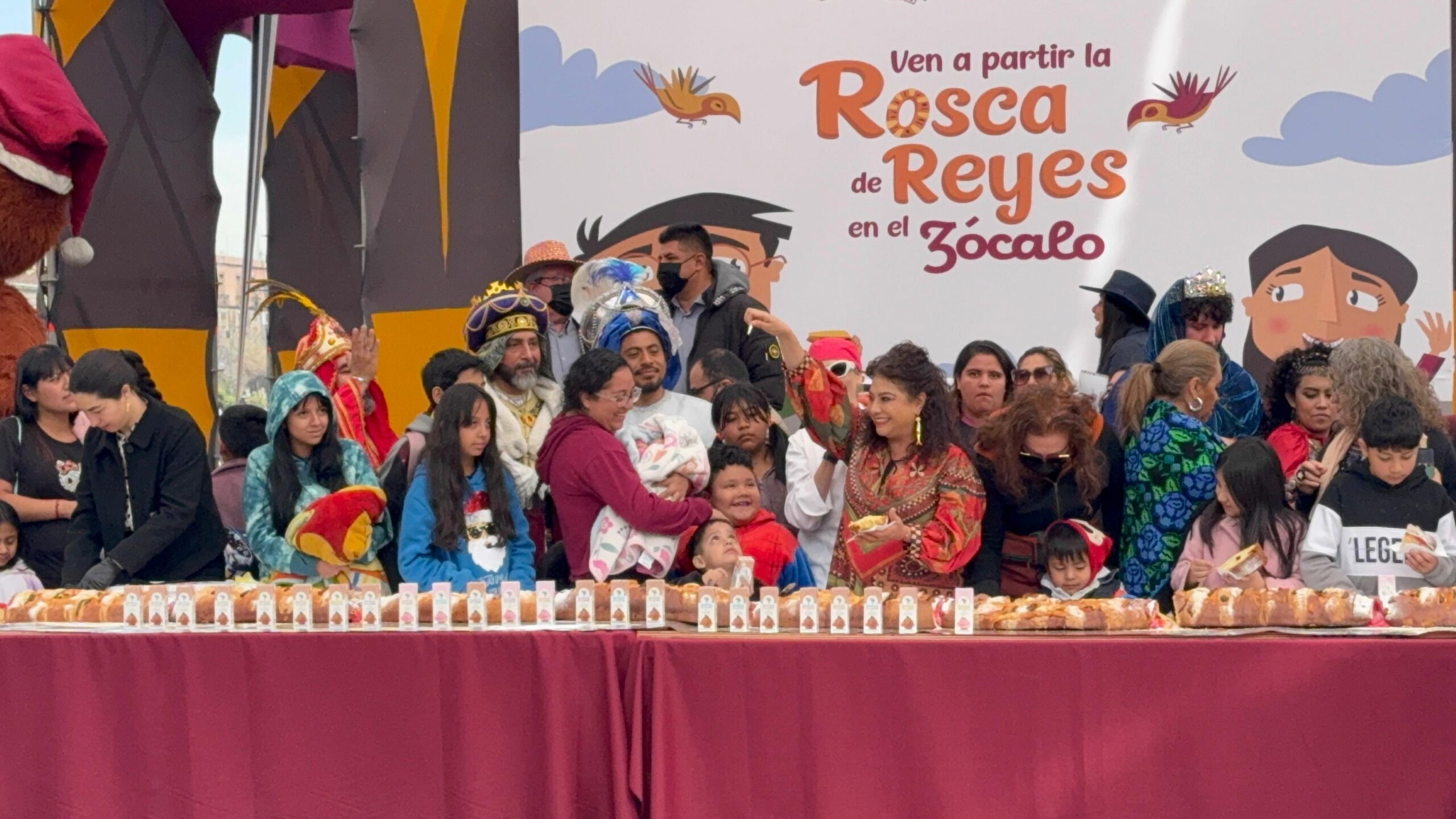 Clara Brugada parte y reparte rosca de reyes de más de 400 metros en el Zócalo de la CDMX