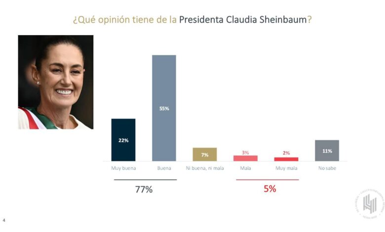 Claudia Sheinbaum empieza con tendencia a favor, el 77% de los mexicanos tiene una opinión positiva de ella.