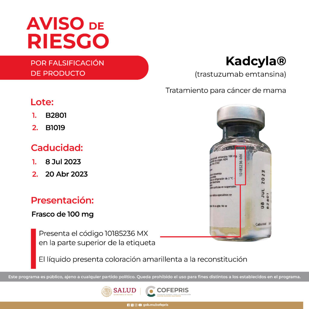 La empresa Roche informó que son falsos los lotes B2801, con caducidad 8 de julio 2023, así como el lote B1019 y fecha de vencimiento 20 de abril 2023, del producto Kadcyla (trastuzumab emtansina), en presentación frasco de 100mg.