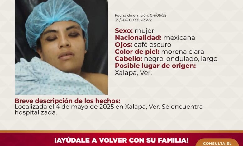 Se trata de una mujer localizada el 4 de mayo de 2025 en Xalapa, al parecer de nacionalidad mexicana, ojos café oscuro, color de piel morena clara, cabello negro, ondulado y largo.