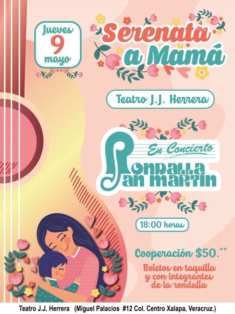 El 9 de mayo a las 18:00 horas en el Museo de la Música Veracruzana, los alumnos de Isabel Ladrón de Guevara ofrecerán un recital de violín; asimismo, en el Teatro J.J. Herrera, la Rondalla San Martín llevará a cabo su “Serenata a mamá”.