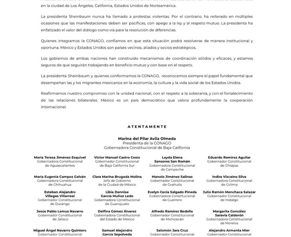 En su cuenta de X compartieron un comunicado donde declaran que «En la CONAGO, y siguiendo el ejemplo de nuestra Presidenta Claudia Sheinbaum Pardo, reiteramos que la violencia nunca será la respuesta ante ningún conflicto. México cree en la paz, el respeto y el entendimiento como base para la relación entre naciones».