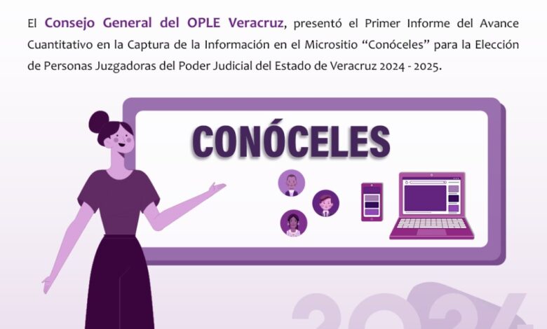 Isabel Ortega/Xalapa, Ver.- En la sesión del Consejo General del Organismo Público Local Electoral del Estado de Veracruz (OPLE Veracruz) se presentó el primer informe del avance cuantitativo en la captura de la información en el Micrositio “Conóceles” para la Elección de Personas Juzgadoras del Poder Judicial del Estado de Veracruz 2024-2025.