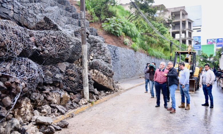 Al realizar un recorrido acompañado por personal de las direcciones de Protección Civil, Obras Públicas, Seguridad Ciudadana y Tránsito y Seguridad Vial del Estado, el Edil explicó que el volumen de las precipitaciones pluviales generó presión sobre la estructura de gaviones, lo que causó que el muro se colapsara parcialmente.