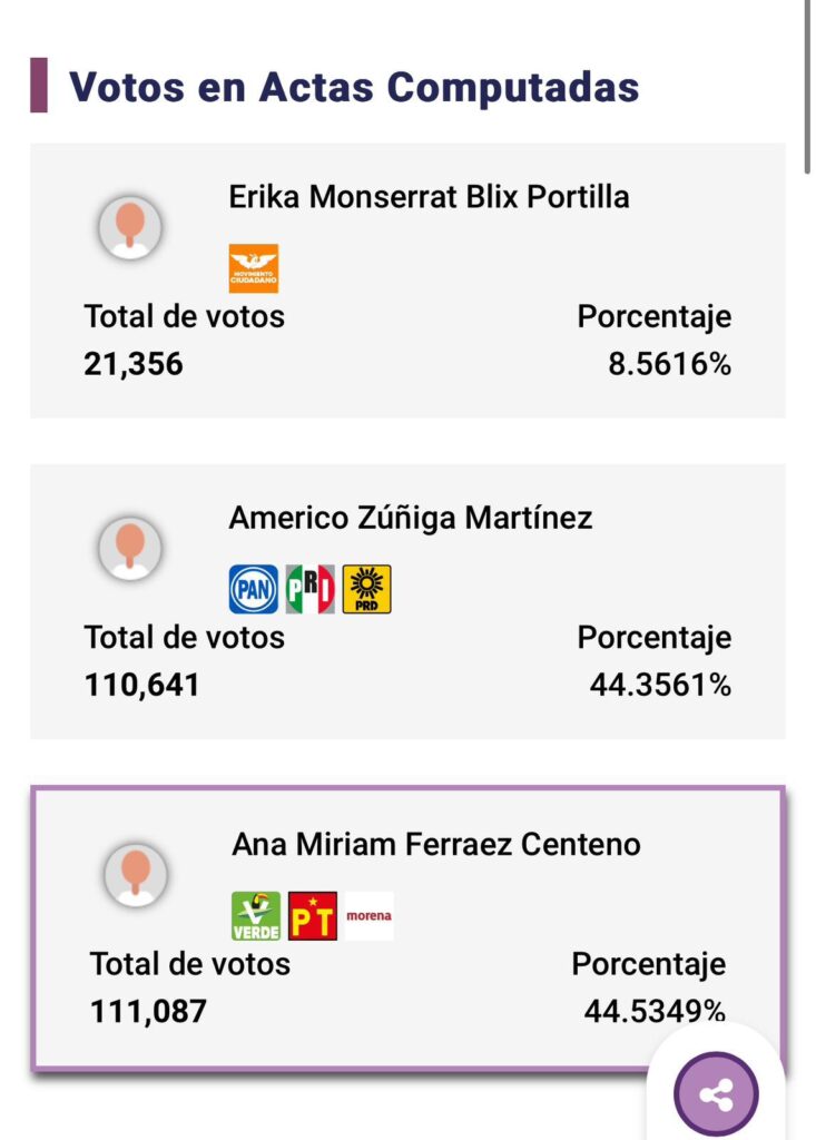 La candidata de Morena, PT y Partido Verde obtuvo un total de 111 mil 87 votos frente a los 110 mil 641 que obtuvo Américo Zúñiga Martínez, candidato de PRI, PAN y PRD y 21 mil 356 de Erika Blix, candidata de Movimiento Ciudadano.