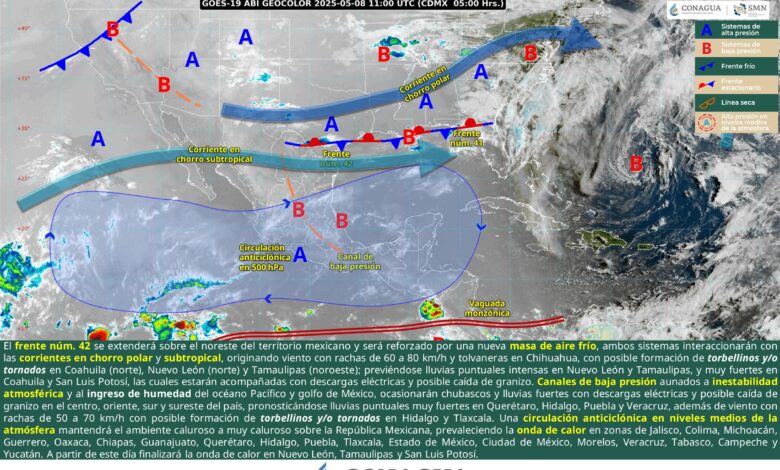 El frente núm. 42 se extenderá sobre el noreste del territorio mexicano y será reforzado por una nueva masa de aire frío, ambos sistemas interaccionarán con las corrientes en chorro polar y subtropical, originando viento con rachas de 60 a 80 km/h y tolvaneras en Chihuahua, con posible formación de torbellinos y/o tornados  en Coahuila (norte), Nuevo León (norte) y Tamaulipas (noroeste); así como rachas de 50 a 70 km/h en Zacatecas, Durango y San Luis Potosí; previéndose lluvias puntuales intensas en Nuevo León y Tamaulipas, muy fuertes en Coahuila y San Luis Potosí, las cuales estarán acompañadas con descargas eléctricas y posible caída de granizo; además de lluvias y chubascos en el norte del país. Por otra parte, canales de baja presión sobre la Mesa Central y el sureste mexicano, aunados a inestabilidad atmosférica y al ingreso de humedad del océano Pacífico y golfo de México, ocasionarán chubascos y lluvias fuertes con descargas eléctricas y posible caída de granizo en el centro, oriente, sur y sureste del país, pronosticándose lluvias puntuales muy fuertes en Querétaro, Hidalgo, Puebla y Veracruz, además de viento con rachas de 50 a 70 km/h con posible formación de torbellinos y/o tornados en Hidalgo y Tlaxcala. Una circulación anticiclónica en niveles medios de la atmósfera mantendrá el ambiente caluroso a muy caluroso sobre la República Mexicana, prevaleciendo la onda de calor en zonas de Jalisco (centro, suroeste y sur), Colima (este y noreste), Michoacán (mayor parte), Guerrero (mayor parte), Oaxaca (oeste, suroeste, sur y este), Chiapas (noroeste y oeste), Guanajuato (sur), Querétaro (centro y sureste), Hidalgo (suroeste), Puebla (sur y suroeste), Tlaxcala, Estado de México (suroeste), Ciudad de México, Morelos, Veracruz (sur), Tabasco (suroeste), Campeche (centro) y Yucatán (suroeste). A partir de este día finalizará la onda de calor en Nuevo León, Tamaulipas y San Luis Potosí.