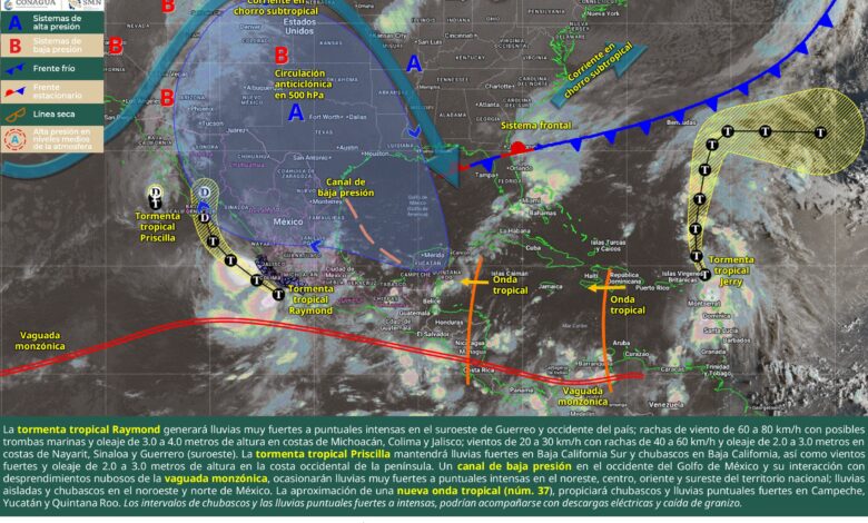 Este día, la tormenta tropical Raymond se desplazará de forma paralela a las costas de Guerrero y Michoacán, generando lluvias puntuales intensas en Jalisco, Colima, Michoacán y Guerrero (suroeste), así como lluvias muy fuertes en Nayarit. Además, se prevén rachas de viento de 60 a 80 km/h con posible formación de trombas marinas y oleaje de 3.0 a 4.0 metros de altura en costas de Michoacán, Colima y Jalisco; vientos de 20 a 30 km/h con rachas de 40 a 60 km/h y oleaje de 2.0 a 3.0 metros en costas de Nayarit, Sinaloa y Guerrero; y de 1.0 a 2.0 metros de altura en costas de Oaxaca y Chiapas. A su vez, se prevé que Priscilla se degrade a ciclón post-tropical frente a la costa oeste de Baja California Sur. No obstante, mantendrá vientos y lluvias fuertes en dicha entidad, además de oleaje de 2.0 a 3.0 metros de altura en la costa occidental de la península. A su vez, los desprendimientos nubosos asociados a su circulación, generarán intervalos de chubascos en Baja California. Un canal de baja presión sobre el occidente del golfo de México en interacción con los desprendimientos nubosos de la vaguada monzónica que permanecerá frente a las costas del Pacífico sur mexicano, ocasionarán lluvias puntuales intensas en Veracruz, Puebla, Hidalgo, Querétaro y San Luis Potosí; puntuales muy fuertes en Chiapas, Oaxaca, Morelos, Estado de México, Guanajuato y Tamaulipas; puntuales fuertes en Tabasco, Tlaxcala, Ciudad de México, Aguascalientes, Nuevo León y Sinaloa; chubascos en Zacatecas, Durango y Sonora; y lluvias aisladas en zonas de Coahuila y Chihuahua. Finalmente, la aproximación de una onda tropical (núm. 37) a la península de Yucatán, propiciará chubascos y lluvias puntuales fuertes en Campeche, Yucatán y Quintana Roo.