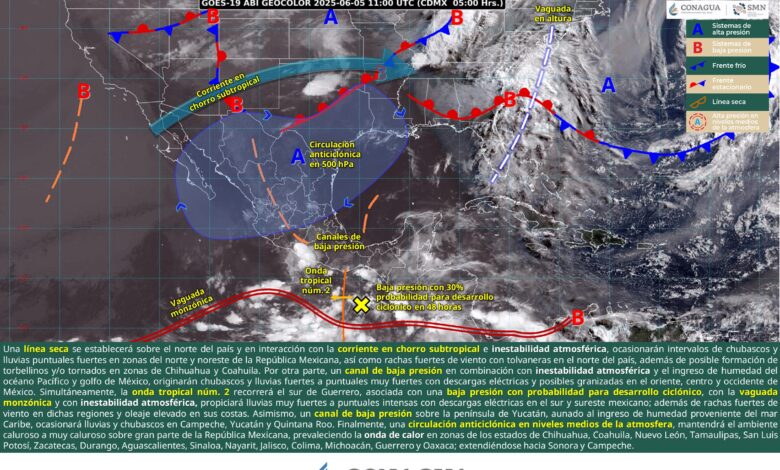 Durante este día, una línea seca se establecerá sobre el norte del país y en interacción con la corriente en chorro subtropical e inestabilidad atmosférica, ocasionarán intervalos de chubascos y lluvias puntuales fuertes en zonas del norte y noreste de la República Mexicana, así como rachas fuertes de viento con tolvaneras en el norte del país, además de posible formación de torbellinos y/o tornados en zonas de Chihuahua y Coahuila. Por otra parte, un canal de baja presión en combinación con inestabilidad atmosférica y el ingreso de humedad del océano Pacífico y golfo de México, originarán chubascos y lluvias fuertes a puntuales muy fuertes con descargas eléctricas y posibles granizadas en el oriente, centro y occidente de México. Simultáneamente, la onda tropical núm. 2 recorrerá el sur de las costas de Guerrero, asociada con una baja presión con probabilidad para desarrollo ciclónico, con la vaguada monzónica y con inestabilidad atmosférica, propiciará lluvias muy fuertes a puntuales intensas acompañadas con descargas eléctricas en el sur y sureste mexicano; además de rachas fuertes de viento en dichas regiones y oleaje elevado en sus costas. Asimismo, un canal de baja presión sobre la península de Yucatán, aunado al ingreso de humedad proveniente del mar Caribe, ocasionará lluvias y chubascos en Campeche, Yucatán y Quintana Roo. Finalmente, una circulación anticiclónica en niveles medios de la atmosfera, mantendrá el ambiente caluroso a muy caluroso sobre gran parte de la República Mexicana, prevaleciendo la onda de calor en los estados de Chihuahua, Coahuila (oeste y suroeste), Nuevo León (sur), Tamaulipas (suroeste), San Luis Potosí (norte), Zacatecas, Durango, Aguascalientes (sur), Sinaloa, Nayarit, Jalisco, Colima, Michoacán, Guerrero (noroeste y oeste) y Oaxaca (centro, sur y este); extendiéndose hacia Sonora (sur) y Campeche (norte y oeste).