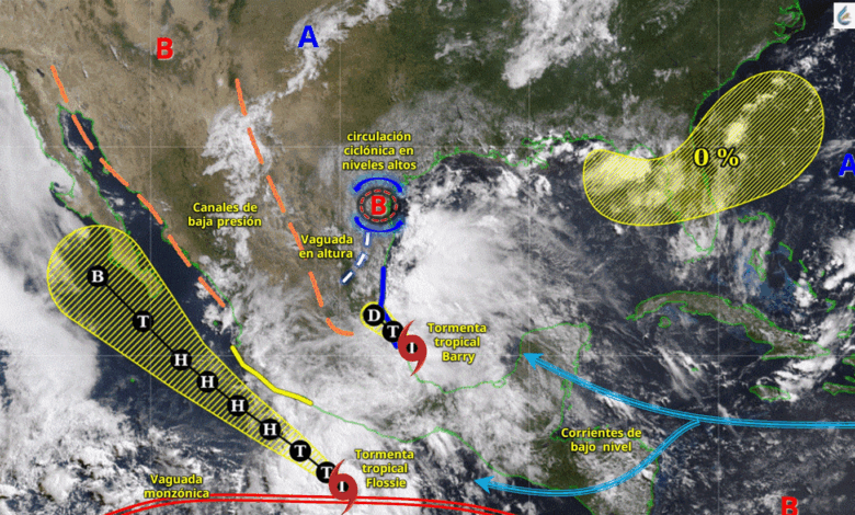 Canales de baja presión sobre la Mesa del Norte, la Mesa Central, el noreste y sureste de la República Mexicana, en interacción con una circulación ciclónica en niveles altos de la atmósfera sobre el noreste del país y el ingreso de humedad generado por las tormentas tropicales Barry y Flossie, además de divergencia y la proximidad de la vaguada monzónica, producirán chubascos y lluvias fuertes a muy fuertes acompañadas con descargas eléctricas en el norte, centro, occidente y sureste del territorio nacional, además de la península de Yucatán, pronosticándose lluvias puntuales intensas en zonas del Estado de México (suroeste), Morelos, Chiapas (oeste y sur) y Tabasco.