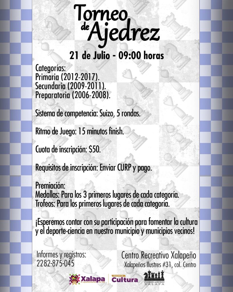 Redacción Xalapa.- El H. Ayuntamiento de Xalapa, a través de la página de Cultura Xalapa, invitó al público en general a participar en el torneo de ajedrez en Xalapa.