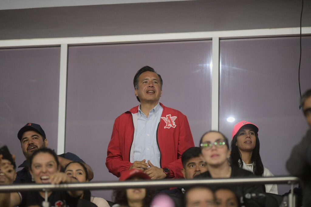 Boca del Rio, Ver., 02/02/24 El gobernador Cuitláhuac García Jiménez asistió al partido inaugural del softball femenil en el Estadio Beto Ávila, donde las locales derrotaron 4-1 a Las Olmecas de Tabasco.