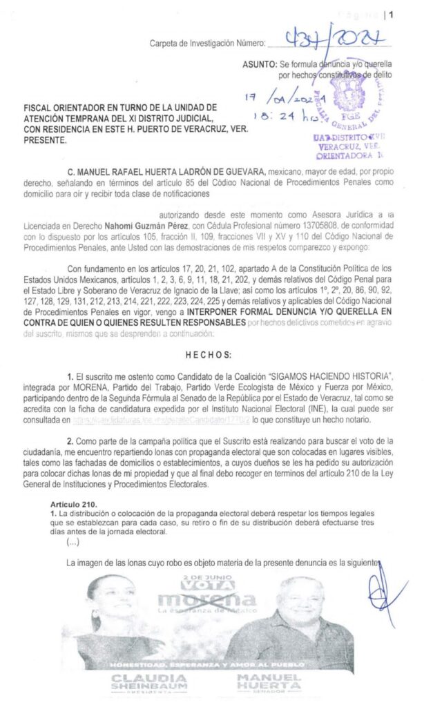 Yhadira Paredes, Xalapa, Ver.- El candidato al Senado de la República por la segunda fórmula, Manuel Huerta Ladrón de Guevara, informó que presentó una denuncia contra quien o quienes resulten responsables por el robo de propaganda de campaña en el Puerto de Veracruz.