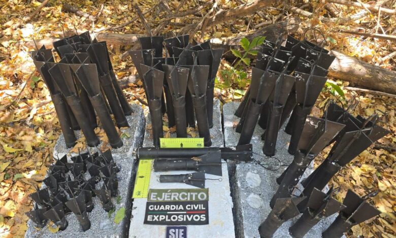 Con el apoyo del equipo antibombas del Ejército Mexicano y el Agrupamiento Especializado en Artefactos Explosivos y Materiales Peligrosos de la Guardia Civil se realizó el hallazgo de los artefactos de fabricación casera sobre un camino de terracería. En la zona, también aseguraron una camioneta de la marca Dodge, línea RAM que cuenta con reporte de robo.