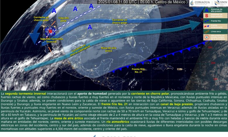 Para este día, la segunda tormenta invernal interaccionará con el aporte de humedad generado por la corriente en chorro polar sobre el noroeste y norte de la República Mexicana, pronosticándose ambiente frío a gélido, fuertes rachas de viento, así como chubascos y lluvias fuertes a muy fuertes en las regiones mencionadas, con lluvias puntuales intensas en Durango y Sinaloa; además, se prevén condiciones para la caída de nieve o aguanieve en las sierras de Baja California, Sonora, Chihuahua, Coahuila, Sinaloa (noreste) y Durango; y lluvia engelante en Nuevo León y Zacatecas.