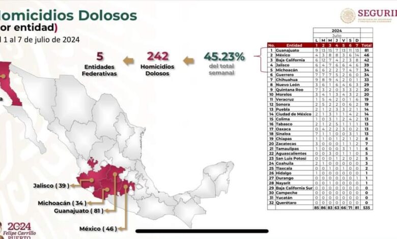 Además, se presentó un concentrado de cifras de homicidio doloso en la primera semana de julio, donde Veracruz ocupa el décimo primer lugar con 19 casos, mientras que sólo cinco entidades concentran más del 45 por ciento.