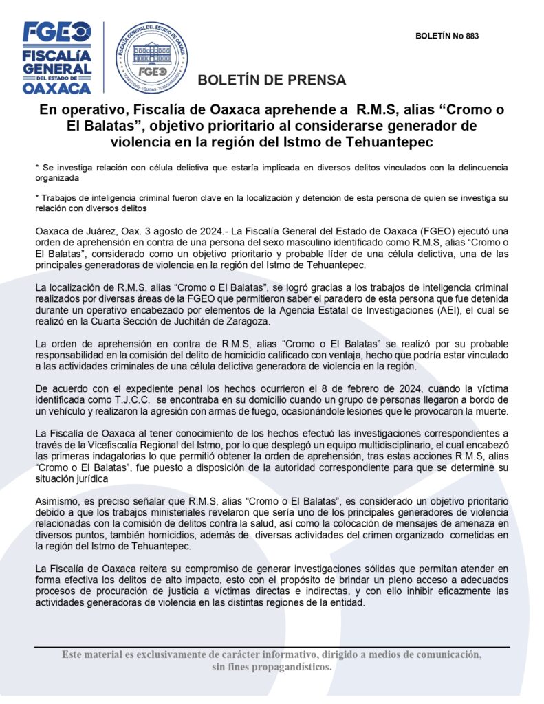 La institución comunicó «La Fiscalía General del Estado de Oaxaca (FGEO) ejecutó una orden de aprehensión en contra de una persona del sexo masculino identificado como R.M.S, alias “Cromo o El Balatas”, considerado como un objetivo prioritario y probable líder de una célula delictiva, una de las principales generadoras de violencia en la región del Istmo de Tehuantepec».