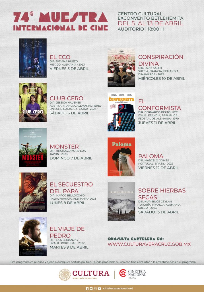 Redacción Xalapa.- La Secretaría de Cultura de Veracruz invitó al público en general a disfrutar de las funciones de la 74 Muestra Internacional de Cine de la Cineteca Nacional, programación conformada por nueve títulos de Japón, Brasil, Portugal, Italia, Francia, Alemania, Turquía, Suiza, Austria, Reino Unido, Suecia, Finlandia, Dinamarca y México.