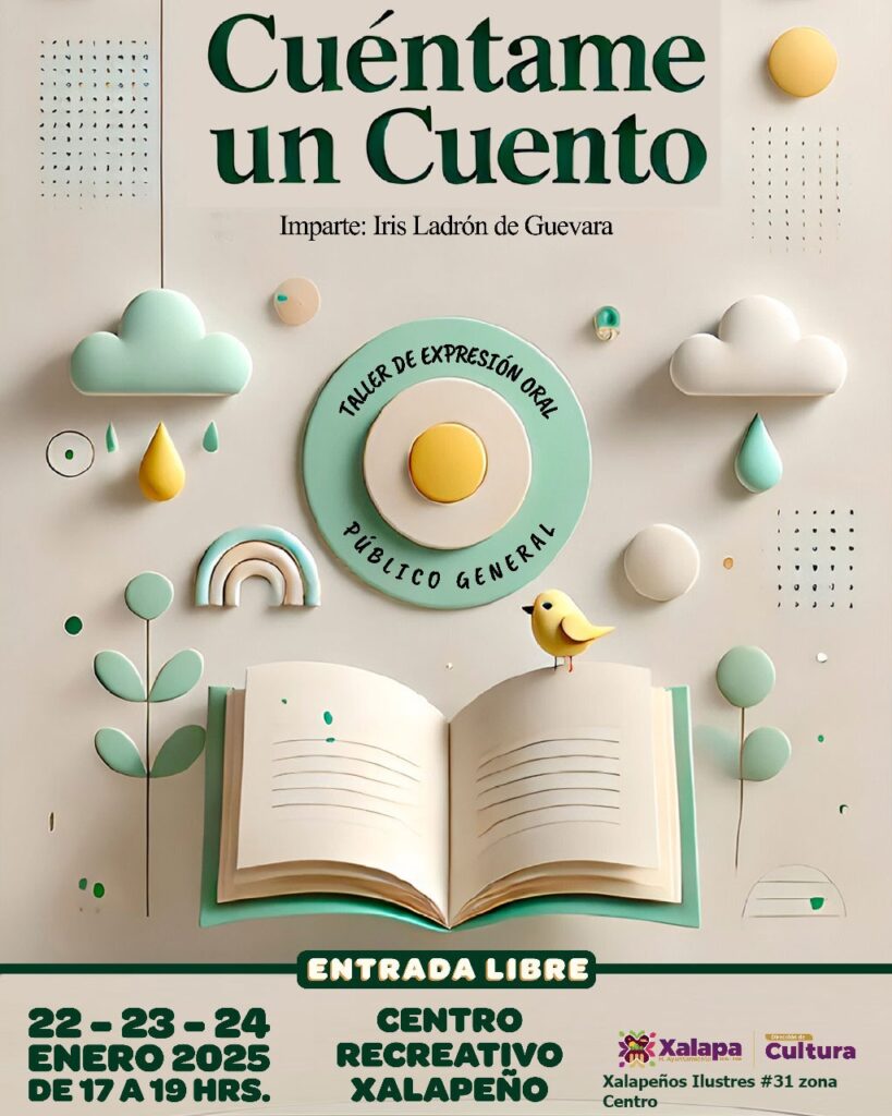 -Taller de expresión oral «Cuéntame un cuento». Imparte Iris Ladrón de Guevara, el 22, 23 y 24 de enero a las 17:00 horas.