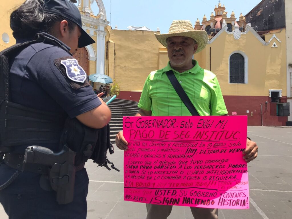 Juan David Castilla.- El docente Juan Moctezuma López lleva meses manifestándose en la ciudad de Xalapa para exigir el pago del seguro institucional; sin embargo, ante la nula respuesta, este mediodía intentó inmolarse frente al Palacio de Gobierno.