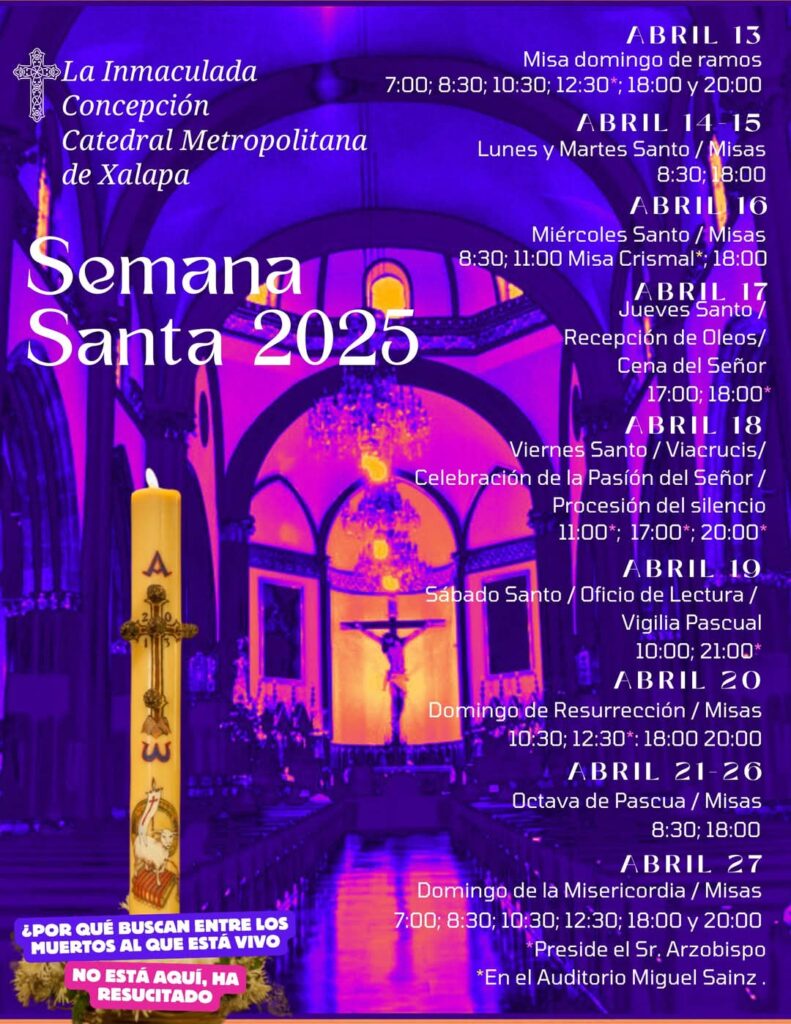 Las celebraciones en la Catedral de Xalapa se realizarán en los horarios normales 7:00 horas; 8:30 horas; 10:30 horas y 12:30 horas que es la que preside el arzobispo de Xalapa Jorge Carlos Patrón Wong, así como 18:30 horas y 20:00 horas.