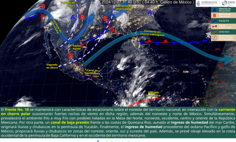Para este día, el frente No. 18 se mantendrá con características de estacionario sobre el noreste del territorio nacional; en interacción con la corriente en chorro polar ocasionarán fuertes rachas de viento en dicha región, además del noroeste y norte de México. Simultáneamente, prevalecerá el ambiente frío a muy frío con posibles heladas en la Mesa del Norte, noroeste, occidente, centro y oriente de la República Mexicana. Por otra parte, un canal de baja presión frente a las costas de Quintana Roo, aunado al ingreso de humedad del mar Caribe, originará lluvias y chubascos en la península de Yucatán. Finalmente, el ingreso de humedad procedente del océano Pacífico y golfo de México, propiciará lluvias y chubascos en zonas del noreste, oriente, sur y sureste del país. Además, se prevé oleaje elevado en la costa occidental de la península de Baja California y en el occidente del territorio mexicano.