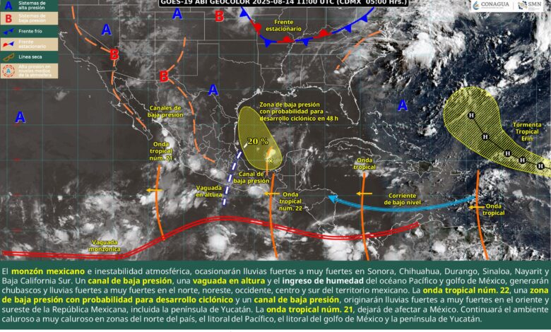 Este día, el monzón mexicano aunado a inestabilidad atmosférica, ocasionará lluvias fuertes a muy fuertes en Sonora, Chihuahua, Durango, Sinaloa, Nayarit y Baja California Sur. Por otra parte, un canal de baja presión sobre la Mesa del Norte y la Mesa Central, en interacción con una vaguada en altura y con el ingreso de humedad del océano Pacífico y golfo de México, generarán chubascos y lluvias fuertes a muy fuertes en el norte, noreste, occidente, centro y sur del territorio mexicano. Simultáneamente, la onda tropical núm. 22, se desplazará sobre el sureste y oriente de la República Mexicana, continuará asociada con una zona de baja presión con probabilidad para desarrollo ciclónico que se localizará en la Sonda de Campeche, además de un canal de baja presión sobre la península de Yucatán; lo cual originará lluvias fuertes a muy fuertes en dichas regiones. La onda tropical núm. 21 se desplazará al suroeste de las costas de Colima y Jalisco, dejando de afectar a México. Finalmente, continuará el ambiente caluroso a muy caluroso en zonas del norte del país, el litoral del Pacífico, el litoral del golfo de México y la península de Yucatán; con temperaturas que podrían superar los 45 °C en Baja California (noreste).