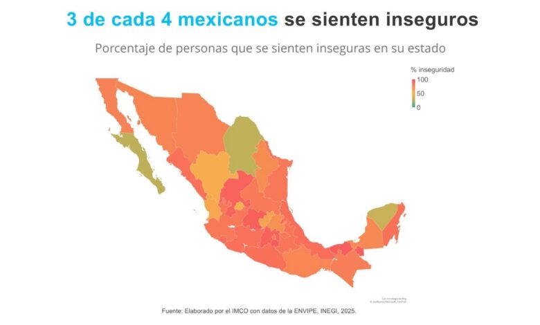 De acuerdo con datos recientes del Instituto Mexicano para la Competitividad (IMCO), basados en encuestas del INEGI 2025, 3 de cada 4 mexicanos se sienten inseguros en sus respectivos estados.