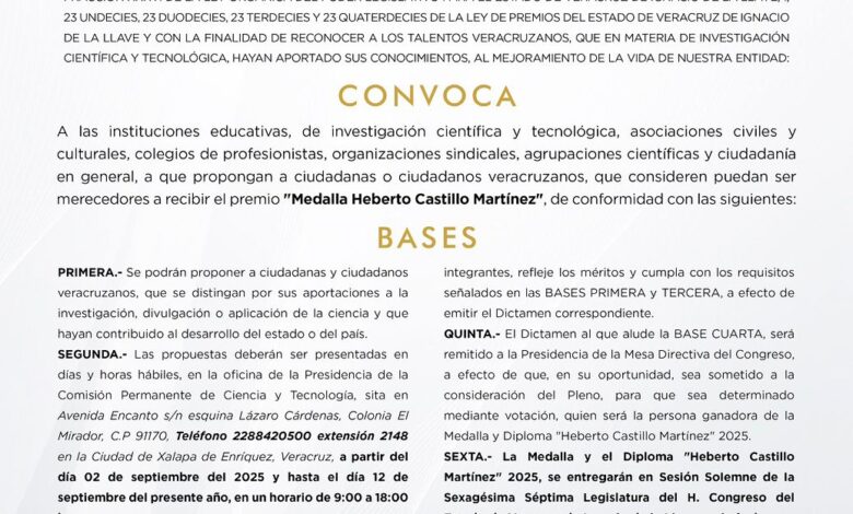 Xalapa, Ver., 03 de septiembre de 2025.- En cumplimiento de lo dispuesto en la Ley de Premios del estado y para reconocer a los talentos que en materia de investigación científica y tecnológica hayan aportado sus conocimientos al mejoramiento de la vida de Veracruz, el Congreso del Estado, por conducto de la Comisión Permanente de Ciencia y Tecnología, emitió la convocatoria para proponer a personas candidatas a la medalla Heberto Castillo Martínez, edición 2025.