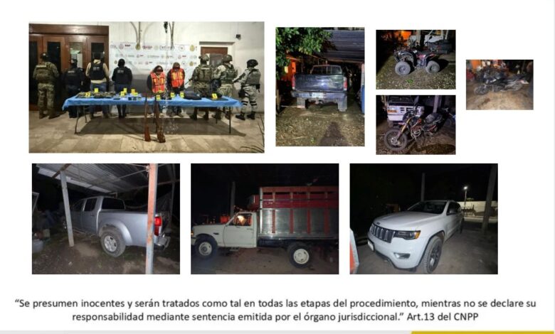 “Así mismo se aseguraron camisolas y un pantalón tipo militar, un arma blanca, prendas de ropa de una corporación policial, un paquete que en su interior contiene pirotecnia, bolsas herméticas que en su interior contienen hierba seca con características similares a la marihuana, así como una sustancia con características similares al cristal, una báscula gramera, teléfonos celulares, un arma corta, armas largas, cartuchos balísticos, carrilleras para armas largas, un dron, un chaleco táctico, una computadora, vehículos y motocicletas”.