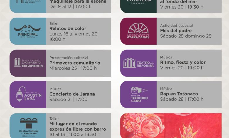 El Museo Teodoro Cano, en Papantla, invita a conocer su acervo permanente en exposición. Se realizará la presentación artística de Rap en Totonaco el sábado 28. Continúa el taller de elaboración de estrellas de palma los viernes, sábados y domingos. Consulta los detalles de estas y más actividades en las redes sociales del @MuseoTeodoroCano. Finalmente, el Centro Cultural del Sotavento, de Tlacotalpan, ofertará el taller Mi lugar en el mundo. Expresión libre con barro del martes 10 al viernes 13 de junio. Conoce más información en las redes sociales del @CentroCulturalSotavento.