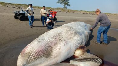 Mediante redes sociales reportaron el hallazgo del cuerpo de un cetáceo de aproximadamente 8 metros de longitud, que tenía una herida en su torso y que mostraba un estado de descomposición.