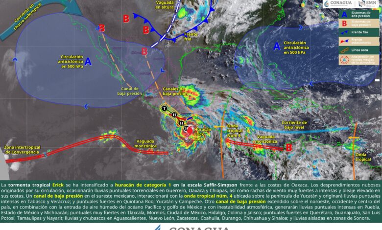 Para hoy, los desprendimientos nubosos originados por la circulación del huracán Erick de categoría 1 en la escala Saffir-Simpson frente a las costas de Oaxaca, ocasionarán lluvias puntuales torrenciales en Guerrero, Oaxaca y Chiapas, así como rachas de viento muy fuertes a intensas y oleaje elevado en sus costas. Un canal de baja presión en el sureste mexicano, interaccionará con la onda tropical núm. 4 ubicada sobre la península de Yucatán y originará lluvias puntuales intensas en Tabasco y Veracruz; y puntuales fuertes en Quintana Roo, Yucatán y Campeche. Por su parte, un canal de baja presión extendido sobre el noroeste, occidente y centro del país, en combinación con la entrada de aire húmedo del océano Pacífico y golfo de México y con inestabilidad atmosférica, generarán lluvias puntuales intensas en Puebla, Estado de México y Michoacán; puntuales muy fuertes en Tlaxcala, Morelos, Ciudad de México, Hidalgo, Colima y Jalisco; puntuales fuertes en Querétaro, Guanajuato, San Luis Potosí, Tamaulipas y Nayarit; lluvias y chubascos en Aguascalientes, Nuevo León, Zacatecas, Coahuila, Durango, Chihuahua y Sinaloa; y lluvias aisladas en zonas de Sonora. Finalmente, una circulación anticiclónica en niveles medios de la atmósfera mantendrá el ambiente caluroso a muy caluroso sobre el noroeste y norte de la República Mexicana, previéndose ambiente extremadamente caluroso con temperaturas superiores a 45 °C en Baja California, Sonora, Chihuahua y Sinaloa; además de prevalecer la onda de calor en Baja California (norte), Durango (norte y oeste) y Sinaloa (norte y centro), así como en zonas de Sonora y Chihuahua.
