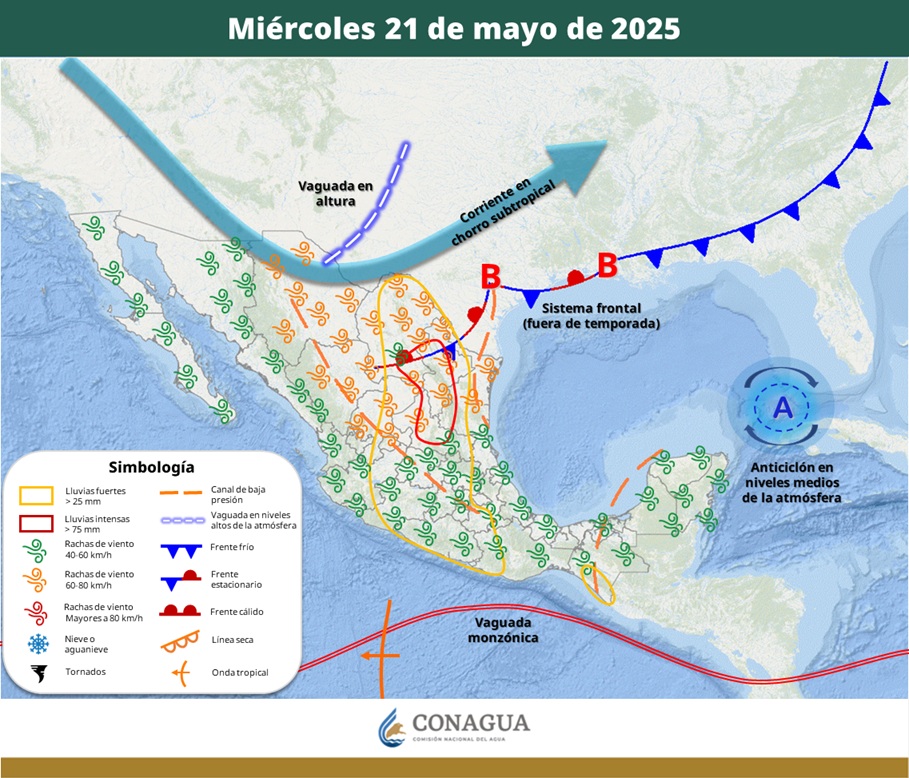 Finalmente, una circulación anticiclónica en niveles medios de la atmósfera, mantendrá el ambiente caluroso a muy caluroso sobre la República Mexicana, prevaleciendo la onda de calor en Sinaloa (centro y sur), Nayarit, Jalisco, Colima (este), Michoacán, Guerrero, Oaxaca, Chiapas (norte), Durango (oeste y sur), Coahuila (suroeste y sureste), Nuevo León (sur), Tamaulipas (centro y suroeste), San Luis Potosí, Zacatecas (noreste, sur y suroeste), Aguascalientes, Guanajuato, Querétaro, Hidalgo, Tlaxcala, Estado de México (norte y suroeste), Ciudad de México, Morelos, Puebla, Veracruz, Tabasco, Campeche y Yucatán (oeste y suroeste).