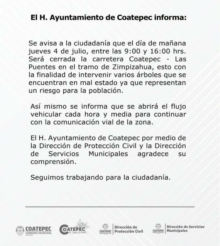 Redacción Xalapa.- El H. Ayuntamiento de Coatepec informó a través de un comunicado que durante este jueves 4 julio se mantendrá cerrada la carretera Coatepec-Las Puentes.