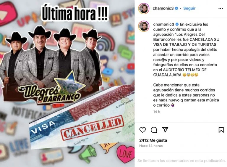 “Los Alegres Del Barranco se les fue cancelada su visa de trabajo y de turistas por haber hecho apología del delito al cantar un corrido para varios narc@s y por pasar videos y fotografías de ellos en su concierto en el Auditorio Telmex de Guadalajara”.