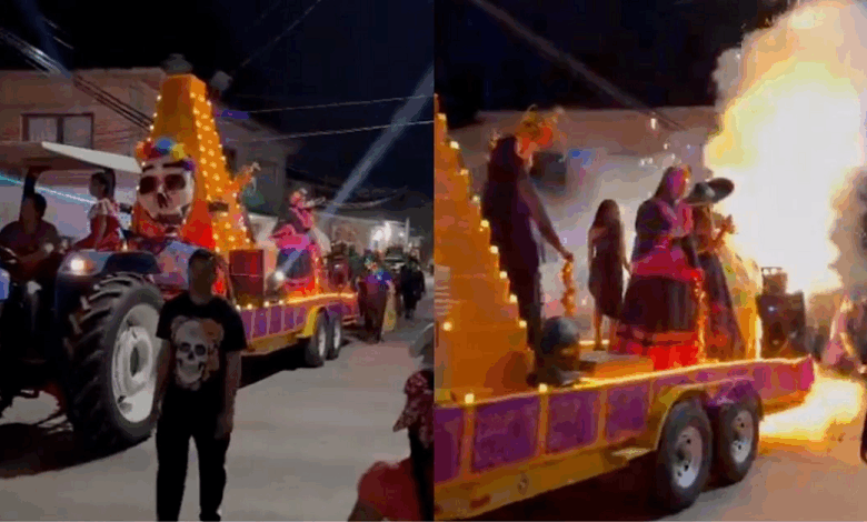 El incidente ocurrió cuando dispositivos pirotécnicos instalados en la parte trasera del vehículo se activaron accidentalmente, generando una fuerte detonación durante el evento conmemorativo del Día de Muertos.