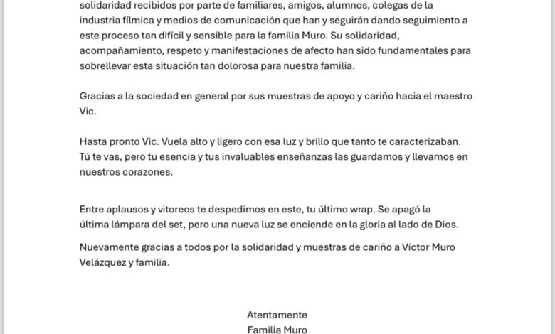 «Por este medio a nombre de la familia Muro, queremos agradecer todo el apoyo y solidaridad recibido por familiares, amigos, colegas de la industria cinematográfica». Expresó la familia.