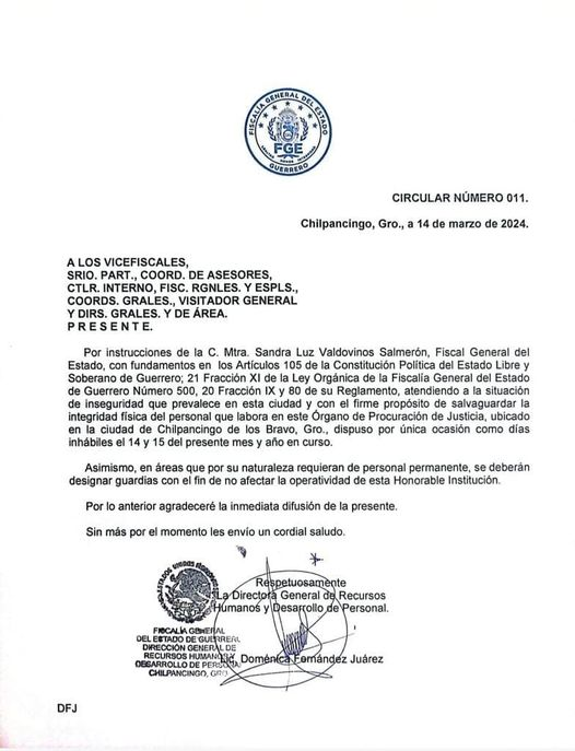 “Atendiendo a la situación de inseguridad que prevalece en esta ciudad, y con el firme propósito de salvaguardar la integridad física del personal que labora en este órgano de procuración de justicia, ubicado en Chilpancingo de los Bravo, Guerrero, dispuso por única ocasión como días inhábiles el 14 y 15 del presente mes del año en curso”, se explica en el comunicado.