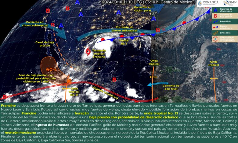 Redacción Xalapa.-Este día, Francine se desplazará frente a la costa norte de Tamaulipas, generando lluvias puntuales intensas en Tamaulipas y lluvias puntuales fuertes en Nuevo León y San Luis Potosí; así como rachas muy fuertes de viento, oleaje elevado y posible formación de trombas marinas en costas de Tamaulipas. Francine podría intensificarse a huracán durante el día.