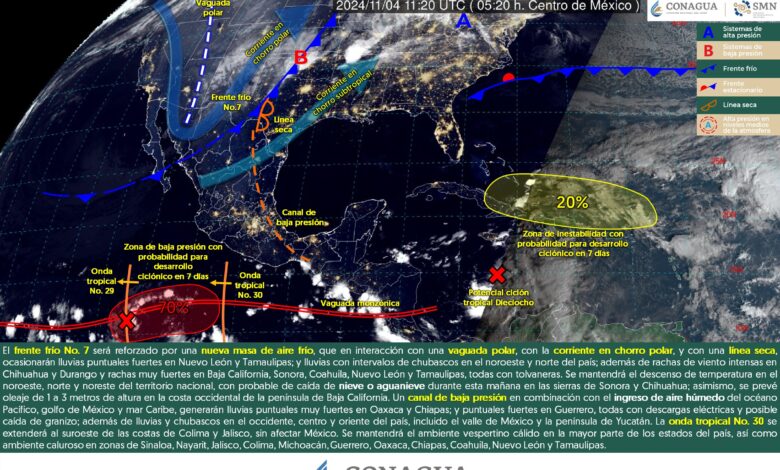 Redacción Xalapa.- El frente frío No. 7 se desplazará sobre el noroeste, norte y noreste del territorio nacional, será reforzado por una nueva masa de aire frío, que, en interacción con una vaguada polar, con la corriente en chorro polar, y con una línea seca sobre Coahuila, ocasionarán lluvias puntuales fuertes en Nuevo León y Tamaulipas; y lluvias e intervalos de chubascos en el noroeste y norte del país; demás de rachas de viento intensas en Chihuahua y Durango y rachas muy fuertes en Baja California, Sonora, Coahuila, Nuevo León y Tamaulipas, todas con tolvaneras.