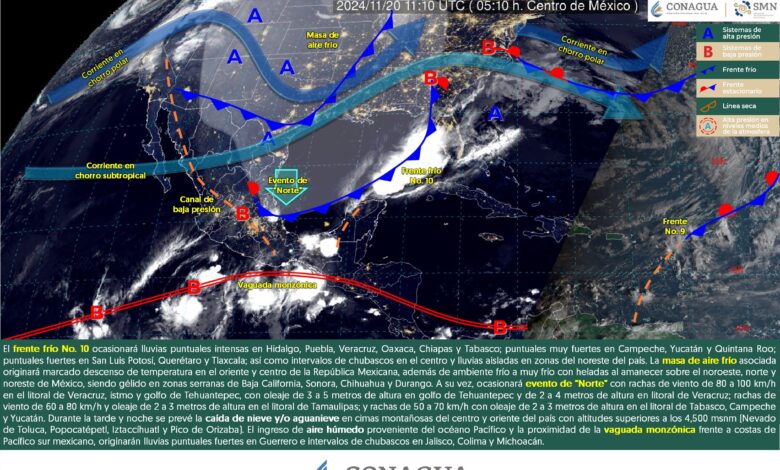 Para hoy, el frente frío No. 10 se desplazará sobre el oriente y sureste del territorio mexicano, así como en la península de Yucatán, ocasionando lluvias puntuales intensas en Hidalgo, Puebla, Veracruz, Oaxaca, Chiapas y Tabasco; puntuales muy fuertes en Campeche, Yucatán y Quintana Roo; puntuales fuertes en San Luis Potosí, Querétaro y Tlaxcala; así como intervalos de chubascos en el centro y lluvias aisladas en zonas del noreste del país. La masa de aire frío asociada al frente cubrirá la mayor parte del territorio nacional y originará marcado descenso de temperatura en el oriente y centro de la República Mexicana, además de ambiente frío a muy frío con heladas al amanecer sobre el noroeste, norte y noreste de México, siendo gélido en zonas serranas de Baja California, Sonora, Chihuahua y Durango. A su vez, ocasionará evento de “Norte” con rachas de viento de 80 a 100 km/h en el litoral de Veracruz, istmo y golfo de Tehuantepec, con oleaje de 3 a 5 metros de altura en golfo de Tehuantepec y de 2 a 4 metros de altura en litoral de Veracruz; rachas de viento de 60 a 80 km/h y oleaje de 2 a 3 metros de altura en el litoral de Tamaulipas; y rachas de 50 a 70 km/h con oleaje de 2 a 3 metros de altura en el litoral de Tabasco, Campeche y Yucatán. Asimismo, durante la tarde y noche se prevé la caída de nieve y/o aguanieve en cimas montañosas del centro y oriente del país con altitudes superiores a los 4,500 msnm (Nevado de Toluca, Popocatépetl, Iztaccíhuatl y Pico de Orizaba). Finalmente, el ingreso de aire húmedo proveniente del océano Pacífico y la proximidad de la vaguada monzónica frente a costas de Pacífico sur mexicano, originarán lluvias puntuales fuertes en Guerrero e intervalos de chubascos en Jalisco, Colima y Michoacán.