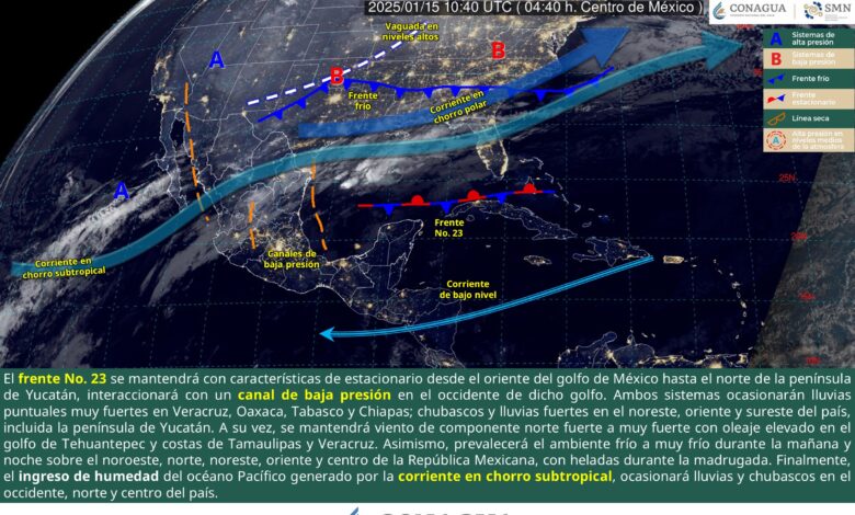 Hoy el frente No. 23 se mantendrá con características de estacionario desde el oriente del golfo de México hasta el norte de la península de Yucatán, interaccionará con un canal de baja presión en el occidente de dicho golfo. Ambos sistemas ocasionarán lluvias puntuales muy fuertes en Veracruz, Oaxaca, Tabasco y Chiapas; chubascos y lluvias fuertes en el noreste, oriente y sureste del país, incluida la península de Yucatán. A su vez, se mantendrá viento de componente norte fuerte a muy fuerte con oleaje elevado en el golfo de Tehuantepec y costas de Tamaulipas y Veracruz. Asimismo, prevalecerá el ambiente frío a muy frío durante la mañana y noche sobre el noroeste, norte, noreste, oriente y centro de la República Mexicana, con heladas durante la madrugada. Finalmente, el ingreso de humedad del océano Pacífico generado por la corriente en chorro subtropical, ocasionará lluvias y chubascos en el occidente, norte y centro del país.