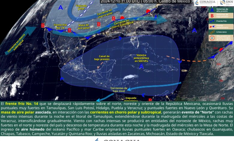 Para hoy, el frente frío No. 14 que se desplazará rápidamente sobre el norte, noreste y oriente de la República Mexicana, ocasionará lluvias puntuales muy fuertes en Tamaulipas, San Luis Potosí, Hidalgo, Puebla y Veracruz; y puntuales fuertes en Nuevo León y Querétaro. La masa de aire polar asociada al frente, en interacción con las corrientes en chorro polar y subtropical, generarán evento de “Norte” con rachas de viento intensas (de 90 a 110 km/h) durante la noche en el litoral de Tamaulipas, extendiéndose durante la madrugada del miércoles a las costas de Veracruz, las cuales se intensificarán gradualmente. Viento con rachas intensas en entidades del noroeste de México y rachas muy fuertes en estados del norte y noreste del país; asimismo, producirá descenso de temperatura durante esta noche y la madrugada del miércoles en la Mesa del Norte. A su vez, el ingreso de aire húmedo del océano Pacífico originará lluvias puntuales fuertes en Oaxaca, así como lluvias aisladas e intervalos de chubascos en Zacatecas, Guanajuato, Michoacán, Estado de México, Tlaxcala y Chiapas; por su parte, la entrada de aire húmedo del mar Caribe ocasionará intervalos de chubascos en Tabasco, Campeche, Yucatán y Quintana Roo. Finalmente, una circulación anticiclónica en niveles medios de la atmósfera, generará ambiente cálido durante la tarde en zonas del noroeste, noreste, centro y oriente del país, sur del litoral del golfo de México y oriente de la península de Yucatán; y caluroso en zonas de Nayarit, Jalisco, Colima, Michoacán, Guerrero, Oaxaca, Chiapas, Campeche y Yucatán.