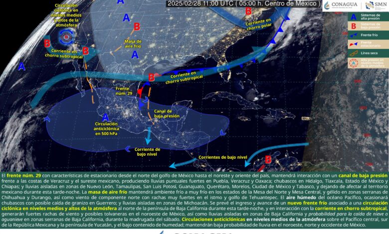 Para hoy, el frente núm. 29 se extenderá con características de estacionario desde el norte del golfo de México hasta el noreste y oriente del país y mantendrá interacción con un canal de baja presión frente a las costas de Veracruz y el sureste mexicano, lo que producirá lluvias puntuales fuertes en Puebla, Veracruz y Oaxaca; lluvias y chubascos en Hidalgo, Tlaxcala, Estado de México y Chiapas; y lluvias aisladas en zonas de Nuevo León, Tamaulipas, San Luis Potosí, Guanajuato, Querétaro, Morelos, Ciudad de México y Tabasco. Simultáneamente, la masa de aire frío asociada, mantendrá ambiente frío a muy frío en los estados de la Mesa del Norte y Mesa Central, y gélido en zonas serranas de Chihuahua y Durango, así como viento de componente norte con rachas muy fuertes en el istmo y golfo de Tehuantepec. Asimismo, se prevé que el frente núm. 29 deje de afectar al territorio mexicano durante la tarde-noche. El ingreso de aire húmedo del océano Pacífico, ocasionarán chubascos con posible caída de granizo en Guerrero; y lluvias aisladas en zonas de Michoacán. Por otra parte, se prevé el ingreso y avance de un nuevo frente frío asociado a una circulación ciclónica en niveles medios y altos de la atmósfera al norte de la península de Baja California durante esta tarde-noche de hoy, en interacción con la corriente en chorro subtropical, generando fuertes rachas de viento y posibles tolvaneras en el noroeste de México, así como lluvias aisladas en zonas de Baja California. Asimismo, existe la probabilidad para la caída de nieve o aguanieve en zonas serranas de Baja California, durante la madrugada del sábado. Finalmente, circulaciones anticiclónicas en niveles medios de la atmósfera sobre el Pacífico central, sur de la República Mexicana y la península de Yucatán, y el bajo contenido de humedad; mantendrán baja probabilidad de lluvia en el noroeste, norte y occidente del territorio nacional; así como ambiente cálido por la tarde, caluroso en estados del litoral del Pacífico y en algunas entidades de la Mesa del Norte y de la península de Yucatán; y muy caluroso con temperaturas máximas de 40 a 45 °C en zonas de Michoacán y Guerrero.